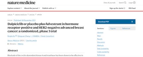 11月4日,国际四大医学期刊之一、英国《自然》旗下《自然医学》(Nature Medicine)在线发表CDK4/6抑制剂达尔西利(SHR6390)联合氟维司群治疗既往内分泌治疗后疾病进展的HR+/HER2-晚期乳腺癌的多中心、随机、双盲III期临床研究(DAWNA-1研究)中期分析结果报告,首次对氟维司群(雌激素受体降解剂)±达尔西利治疗激素受体阳性晚期乳腺癌的有效性和安全性进行了比较。研究结果显示,达尔西利+氟维司群组与安慰剂+氟维司群组相比,无进展生存期(PFS)显著延长。该项研究由中国医学科学院肿瘤医院徐兵河教授担任leading PI,全国39家医院参研,由BBIN宝盈医药临床研发团队支持完成。
